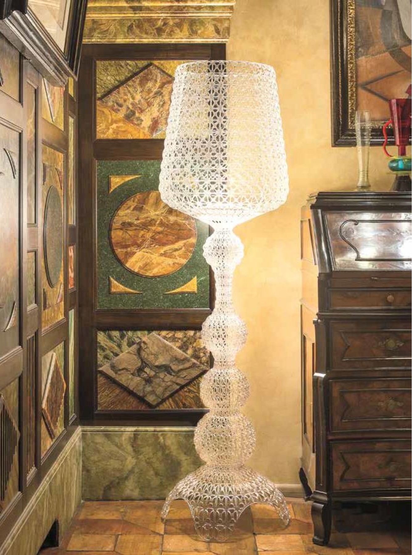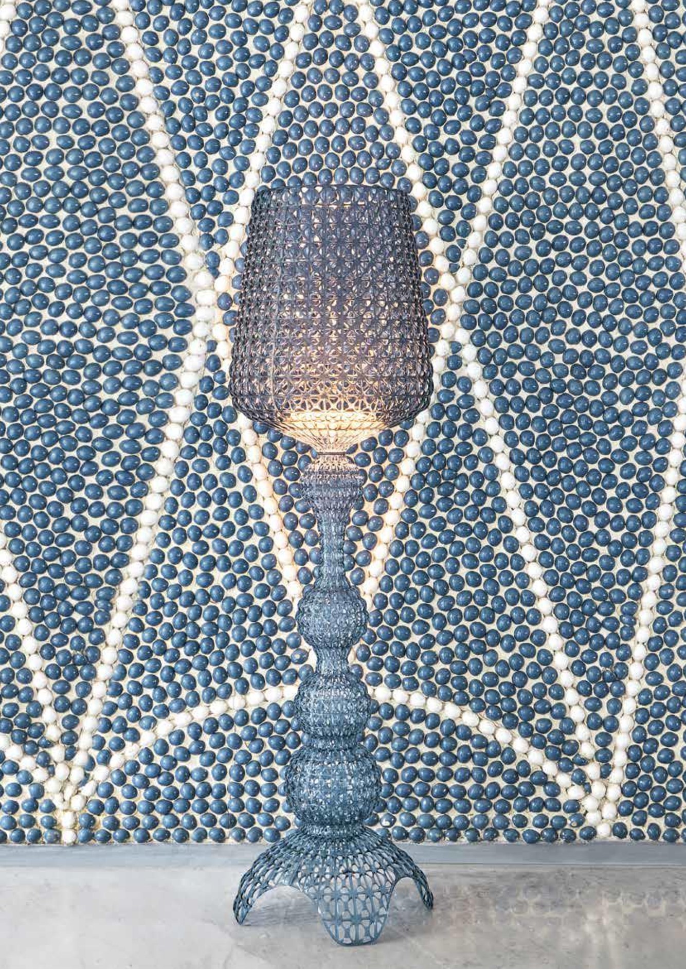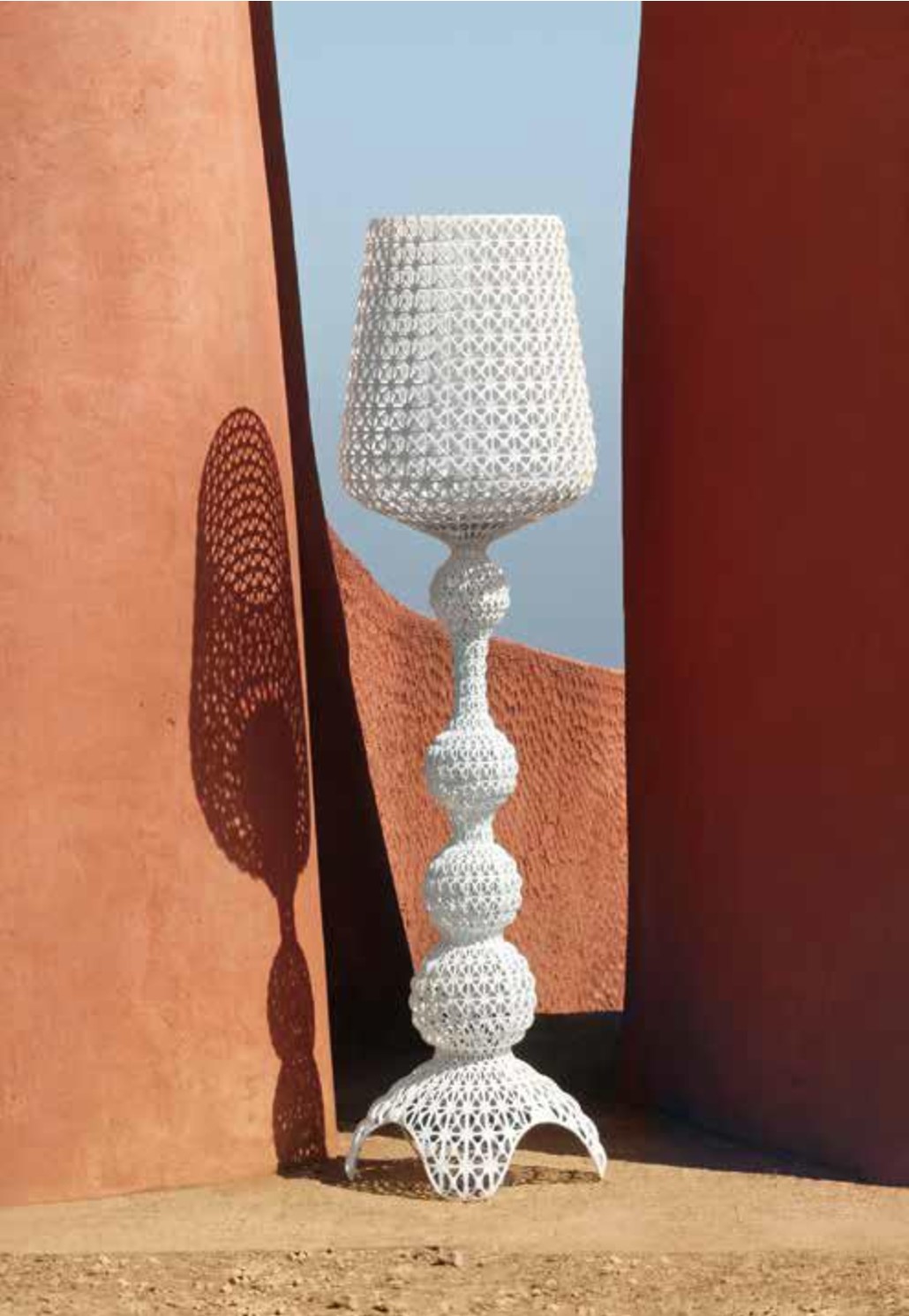 La lampada da terra Kabuki è realizzata ad iniezione di tecnopolimero in uno stampo, che consente di avere una struttura “FORATA” che riproduce l’antica lavorazione dei “Merletti” delle nostre nonne!  con una particolare superficie traforata da cui si diffonde la luce.