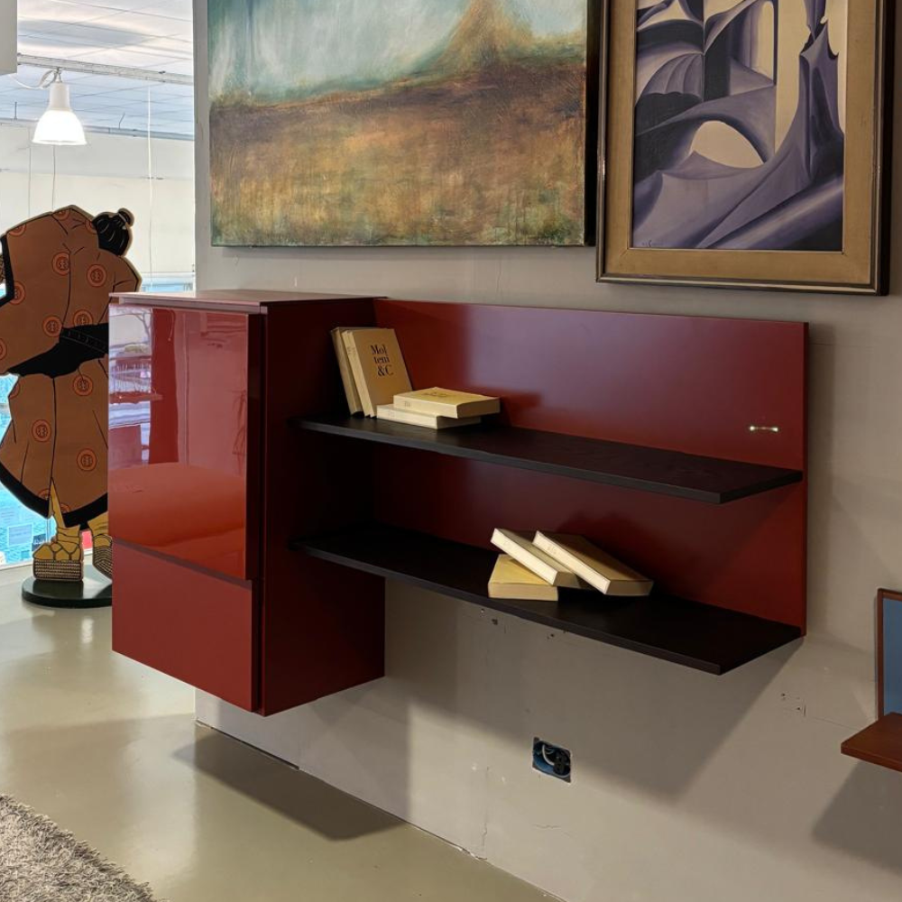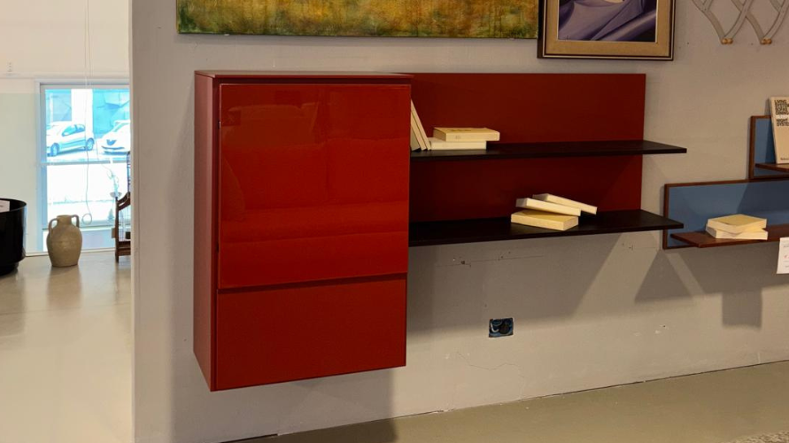 505 System, un sistema versatile per la zona living, in versione sospesa. Contenitore per stoviglie e oggetti per la zona pranzo. Con agganci a muro solidi e sicuri ma come è tradizione Molteni “Invisibili”. Asimmetria anche nello spessore delle ante.