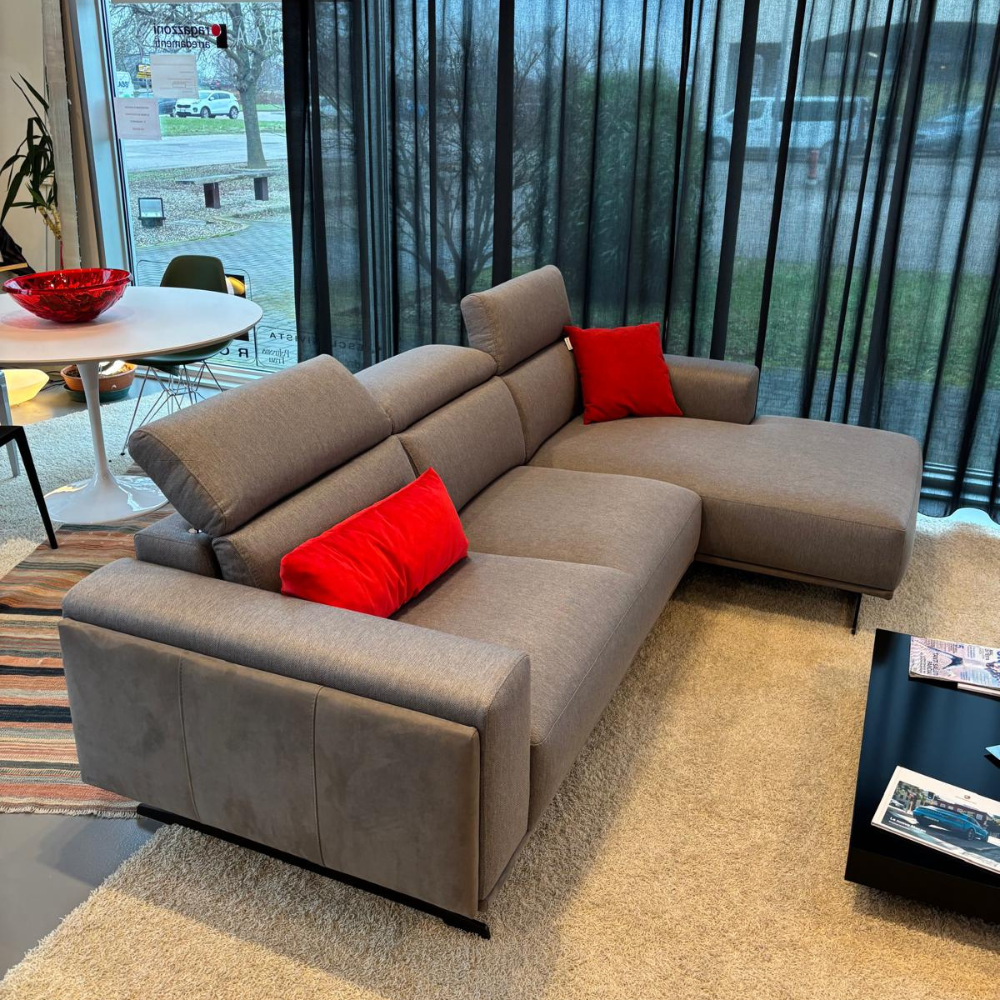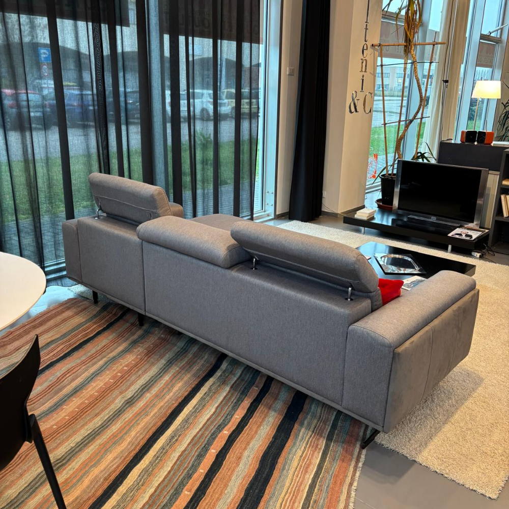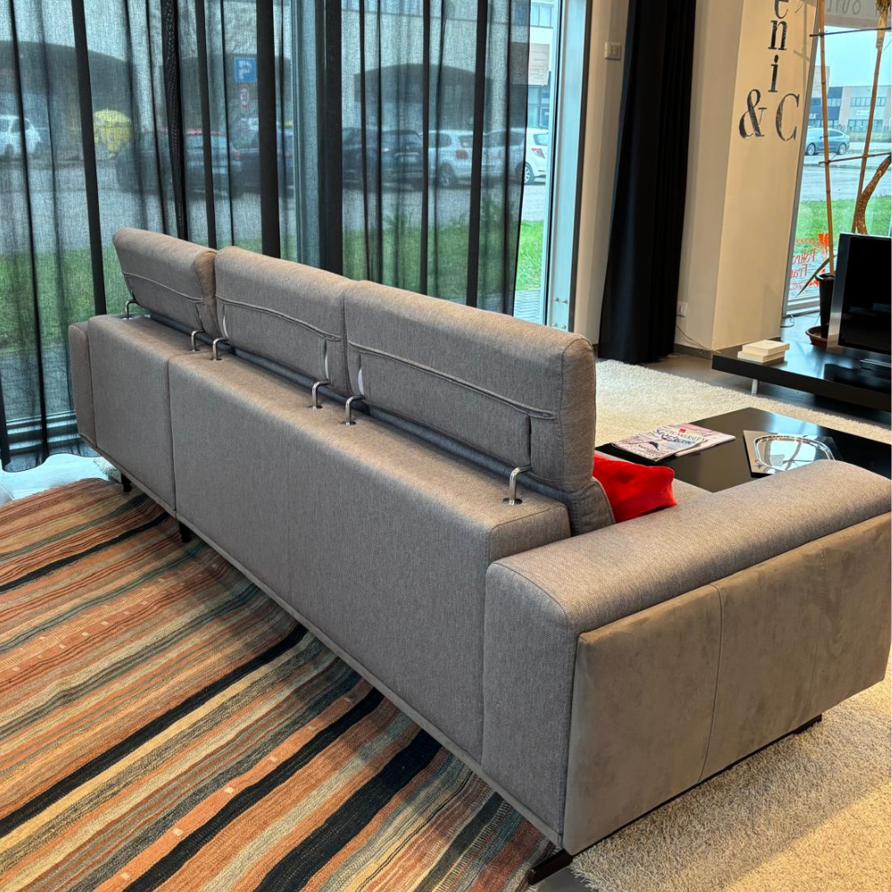 Divano con seduta confortevole con poggiatesta reclinabili in varie posizioni. Scocca esterna rivestita in nabucco di colore diverso dal tessuto salotto per dare personalità ad ogni divano