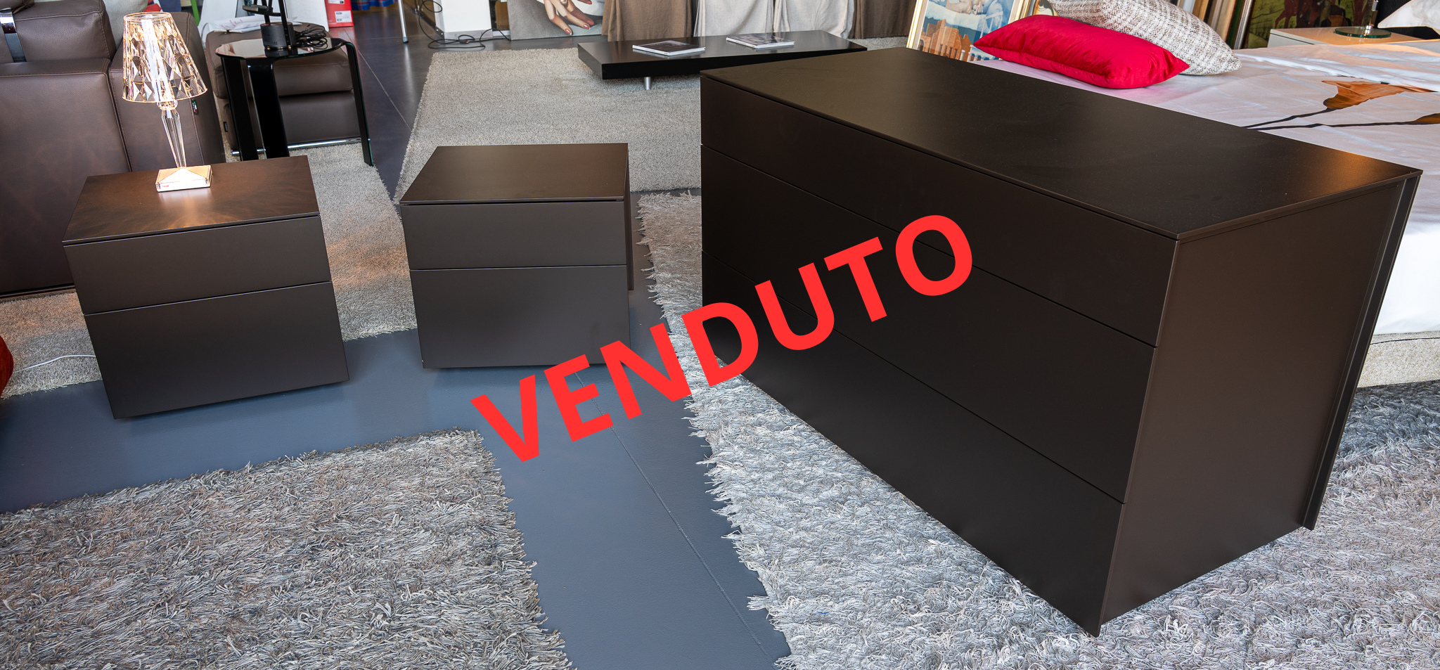 Gruppo notte composto da ampia e profonda cassettiera con tre cassetti e due comodini a due cassetti ciascuno.