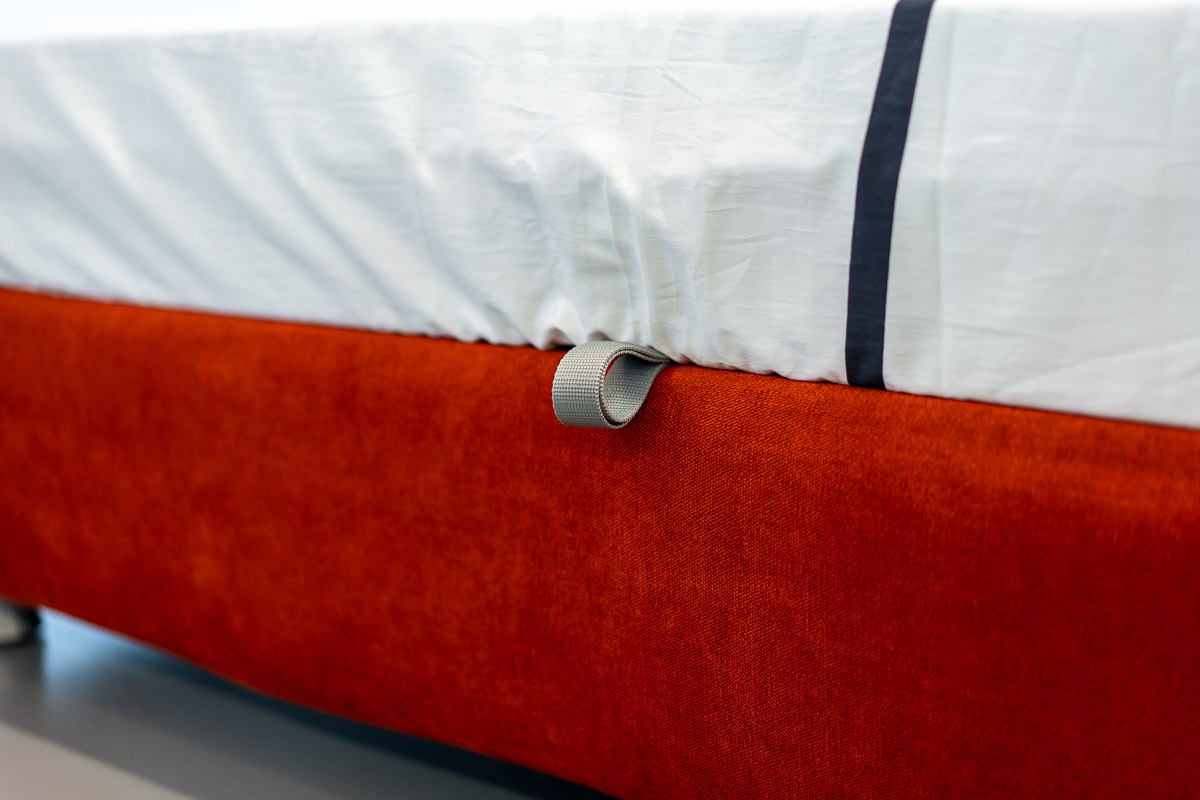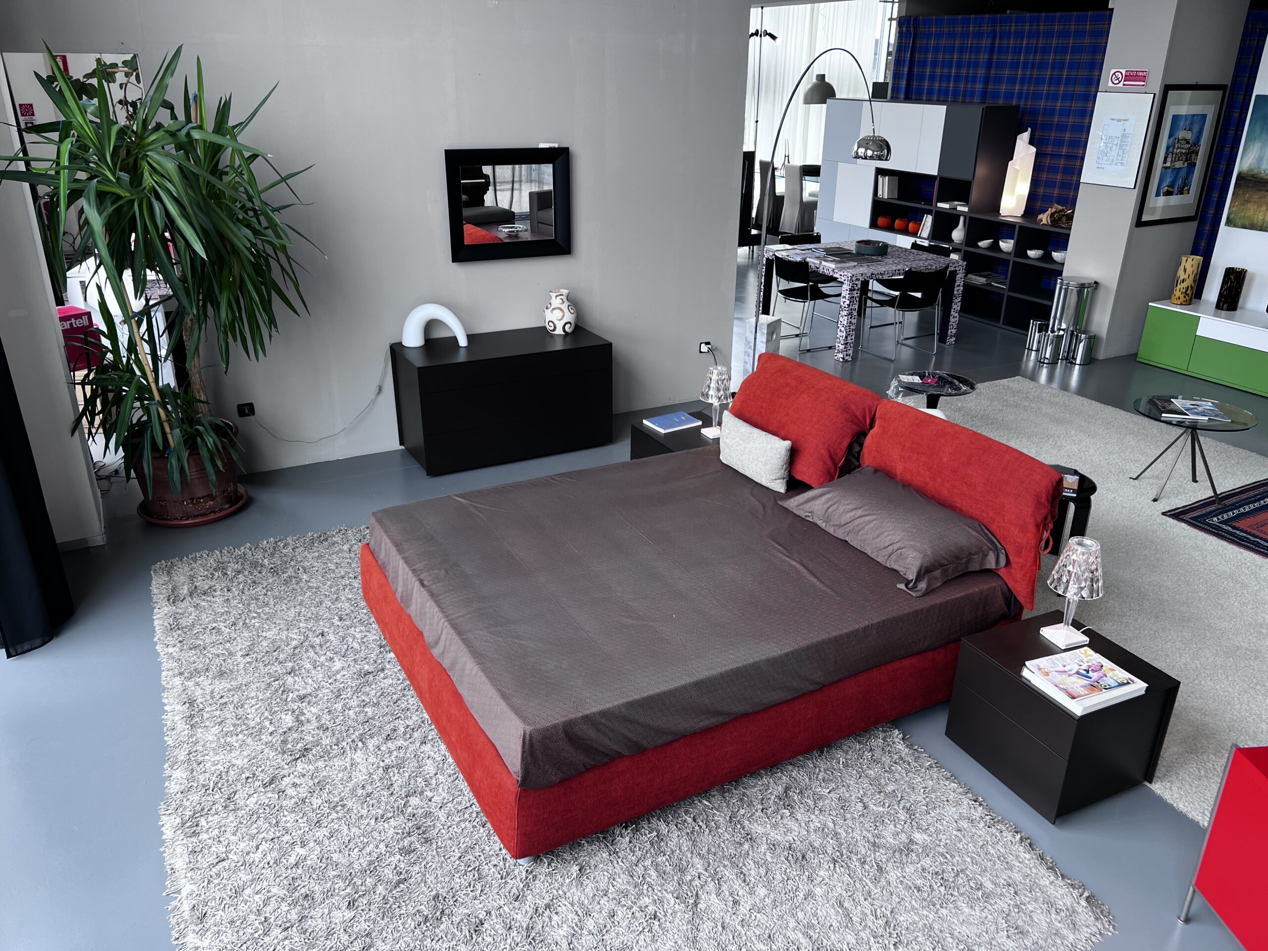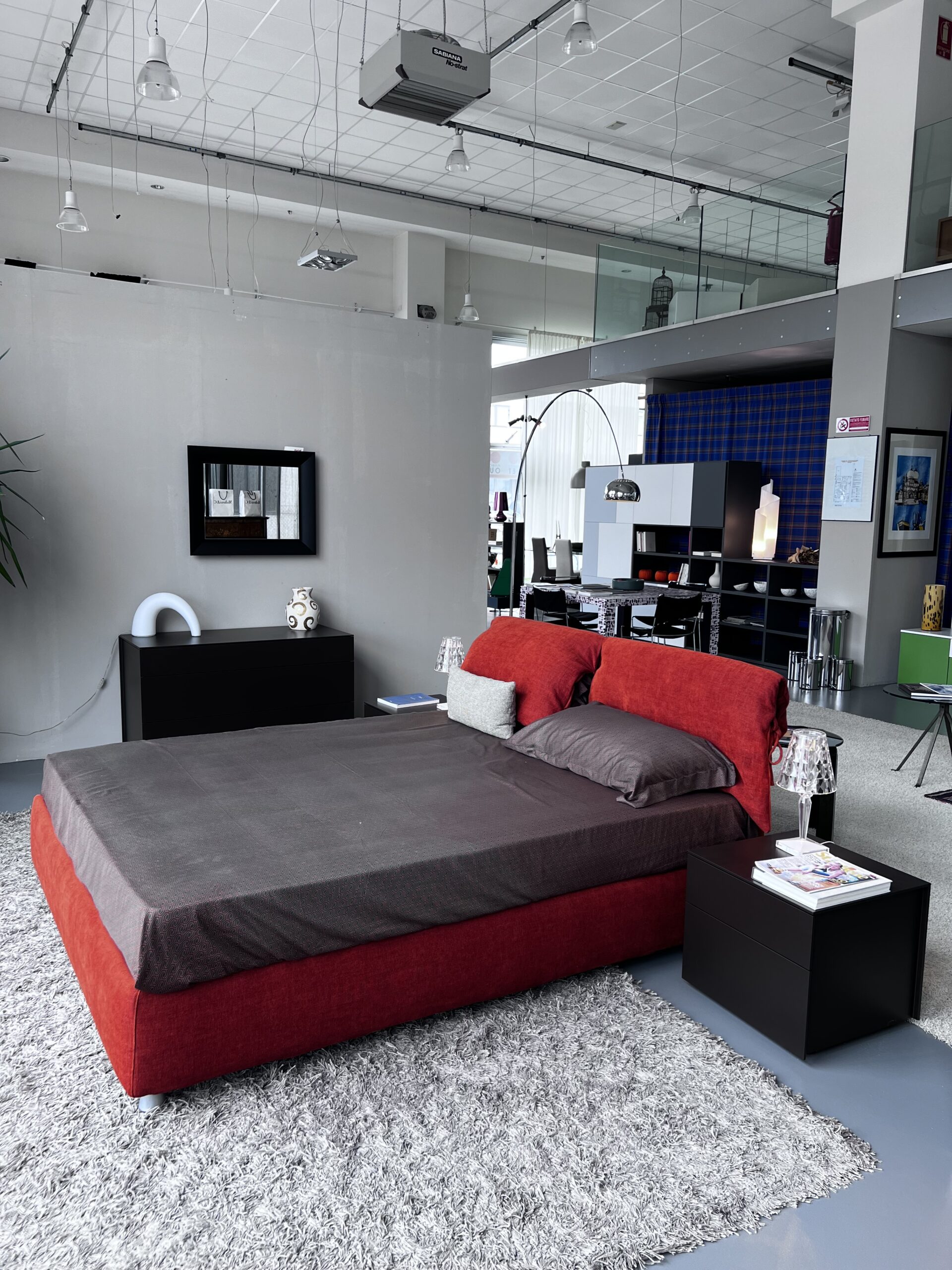 Letto matrimoniale imbottito, con morbida testata realizzata nel prestigioso tessuto Urban color rosso-aranciato. Completamente sfoderabile.