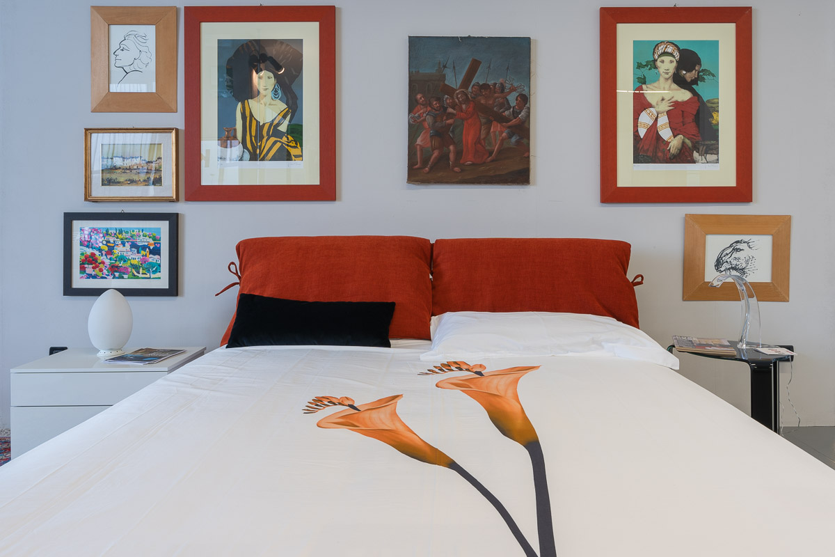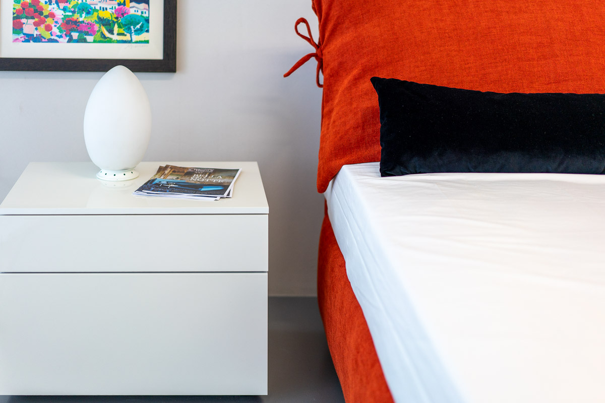 Letto matrimoniale imbottito, con la morbida testata realizzata nel prestigioso tessuto Urban/5 color rosso-aranciato, dove ogni dettaglio è realizzato a regola d’arte.
